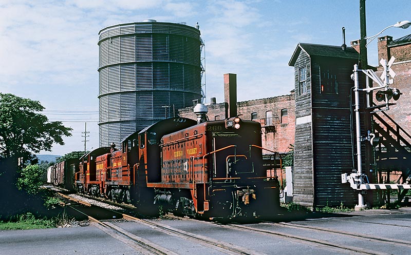 ABOVE: The loss of the crossing watchman’s jobs not only displaced the men working these shanties, but dis-placed the building as well. It was a piece of “Americana” lost forever. This job lasted into the mid 1980’s on the LV main line into the Conrail era when it was closed as a through route. On June 24, 1974, a “Heiney Lehigh” led by “Pups” brings an Extra west by the Hamilton Street gate tower in Allentown. This scene is radically changed now. The main line and myriad industrial spurs are torn out and have been replaced by “upscale” condo buildings and office buildings. The right-of-way is now a street named Riverview Street. —Photo by Bob Wilt, collection of Mike Bednar