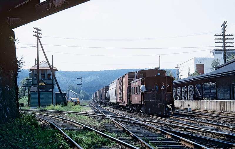 ABOVE: This picture illustrates what was an everyday scene on the railroad that is now GONE! Train LV-2 is pictured leaving Lehighton on June 9, 1973. Flagman Bobby “Bow-wow” Kromer looks to Lehighton Tower for a roll-by signal from Towerman Bob Remaley. Today, Lehighton Tower, cabooses, flagmen and the Lehighton freight house are gone, as is the former LV main line. Former Lehigh Valley caboose 95023 stands along the old LV right-of-way. —Photo by Mike Bednar