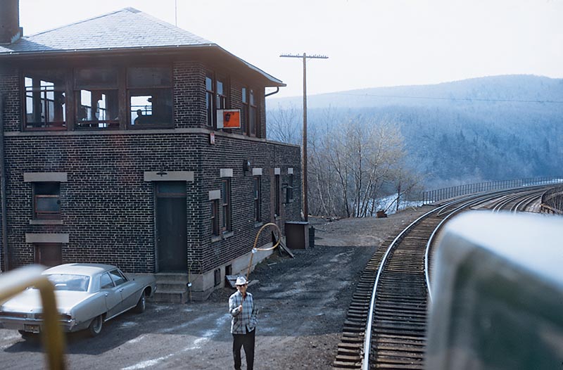 ABOVE: When I hired out in LV tower service in 1966, there were still five towers in the NJ&L District. The CNJ had eight towers working the Pennsylvania Division. The operator at PQ (Nesquehoning Junction) was responsible for the Nesquehoning Branch and CNJ main line from Packerton Junction to Hetchel. I was riding along with Eddie Mink and the CNJ AW-1 crew when 2nd trick operator Cletus Sullivan “hooped up” train orders to us at PQ. The remains of PQ Tower still exist and can be seen by riding the Lehigh Gorge Scenic Railway out of Jim Thorpe. This photo was taken April 21, 1971. PQ closed in April 1972. —Photo by Mike Bednar